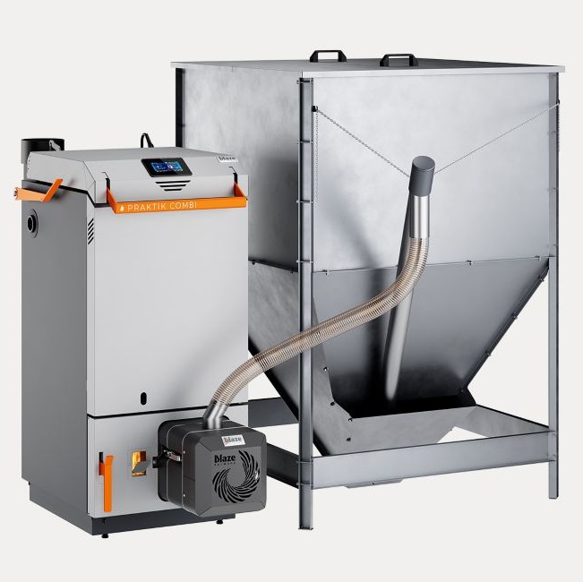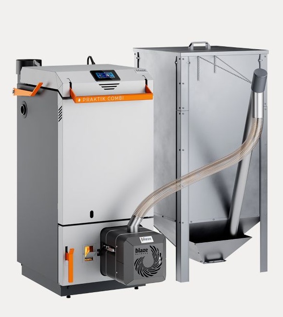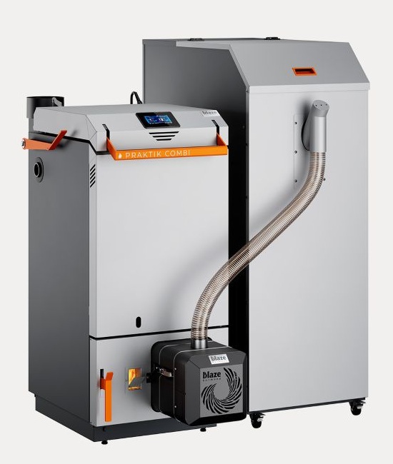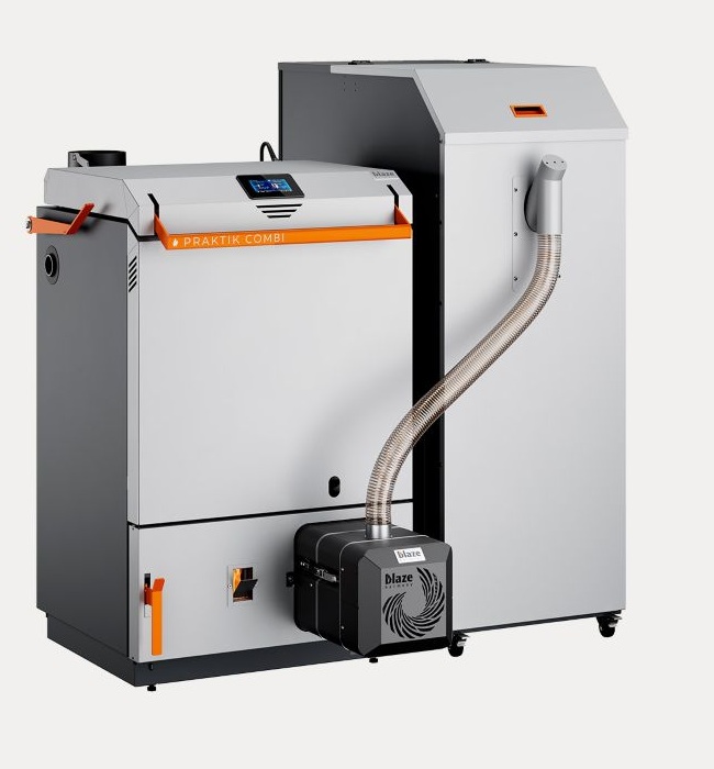 Kocioł hybrydowy Blaze Praktik Combi to nowoczesne urządzenie grzewcze łączące technologię zgazowania drewna z w pełni automatycznym spalaniem pelletu. Rozwiązanie takie zapewnia ciągłą pracę kotła grzewczego z możliwością łatwego przełączenia na ręczny załadunek, gdy palnik pelletowy zostanie automatycznie wyłączony.